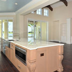 Like the wood tones in the island as well as floor and beam