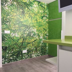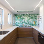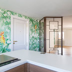 In this kitchen, dramatic and playful botanical wallpaper helps define a portion of the room as its own functional zone with a small island.