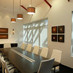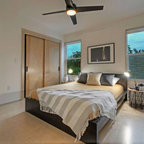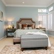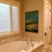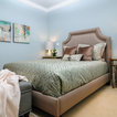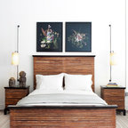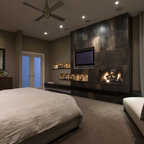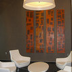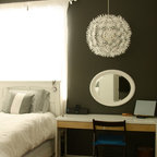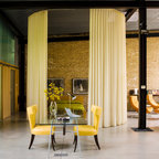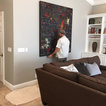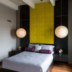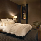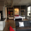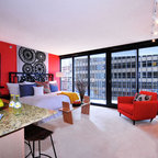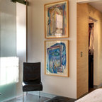 In this LA loft, the client chose a large abstract behind the bed to formalize the area and lend an elegant feel to this urban loft. Interior Design by Shelley Samuels, Dreamspace 3D rendering 323-460-7008