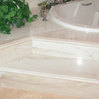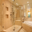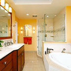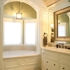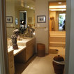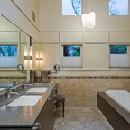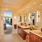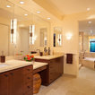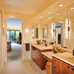 AFTER: Sconces on large mirrors at the sink vanities now offer functional task lighting. Recessed cans on dimmers provide ambient light for whatever mood is desired. Dimmers are especially useful in the tub area, where relaxation and romance are priorities. Wall sconces offer additional ambient and decorative light.