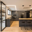 Combinación negro con madera, la puerta de cristal corredera, toda la iluminación es muy original, tanto las lámparas de la barra con las líneas en el techo y pared de la derecha... Un 10!!!