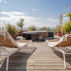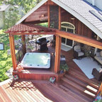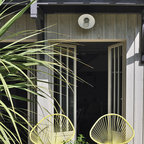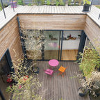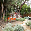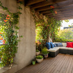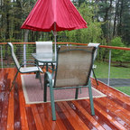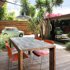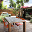 Raised dining deck with driveway beyond. Photo by Clark Dugger