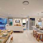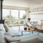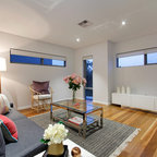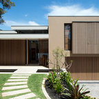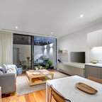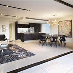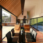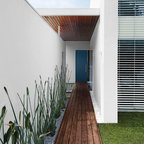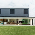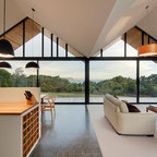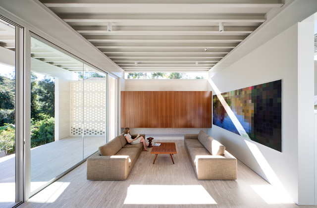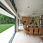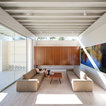 Expansive windows Aluminium frames have strength and lightness, making them ideal for the large expanses of glass that characterise modern and contemporary homes. The large glass panels and minimalist frames allow for maximum entry of light and unobstructed views. Here, aluminium frames blend with the light colour palette of the living room and balcony, and visually merge with the walls and ceiling of the home.