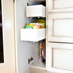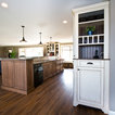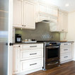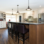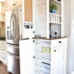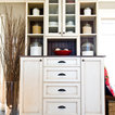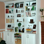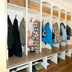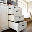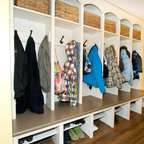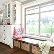 Beneath this large window with a tranquil view is a bench top made of hickory plywood that has a solid edge. Imagine reading or playing a board game on this bench that is as aesthetic and functional. It is built in hickory and stained in ‘american walnut’. Built-in open cubbies with wicker baskets are excellent for lots of hidden storage. The open framed doors are designed with an ogee outside profile and a furniture kick.