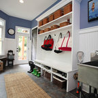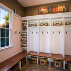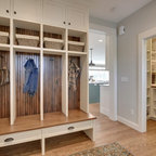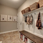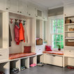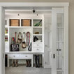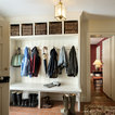 I like the design of this storage area in the mud room because the shoes go on the bottom, the coats go in the middle, and there are baskets on top.