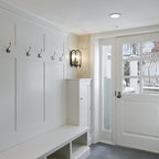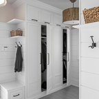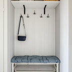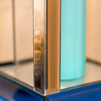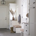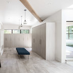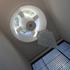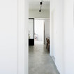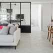 White frameless doors were used in the master and guest bedrooms, extending and brightening the hallway when left open. Accents of graphic and color were also used against a pared down material palette to form the backdrop for the owners’ collection of objects and artwork that was a reflection of the young couple’s vibrant personalities.