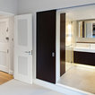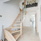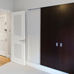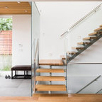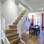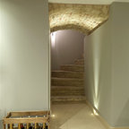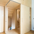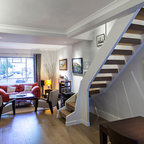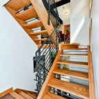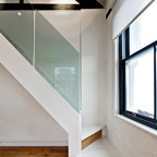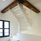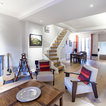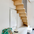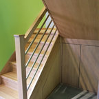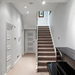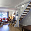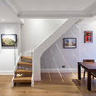 Как скрыть лестницу ? Достаточно выкрасить ее боковые части в тон стен. А чтобы поддержать общую колористику, ступени лучше сделать из дерева или из материала такого же цвета и фактуры, как и пол помещения.