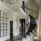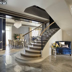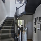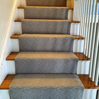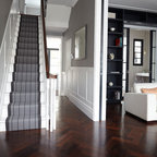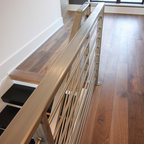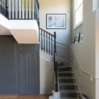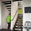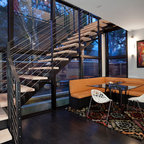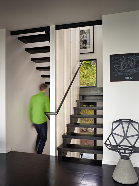 stairs from mudroom to main floor. stringer could be in wall to give similar look (left side of image). Exposed stringer (one closest to dining room table) and treads could be stained/painted to match dark (anodized bronze or black) and natural would color scheme. Wall finish at wall only for the stair run could be natural wood and transition to drywall once past end of stairs