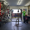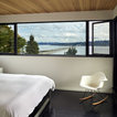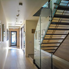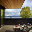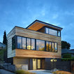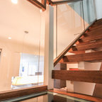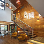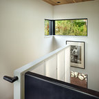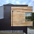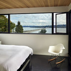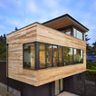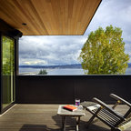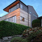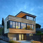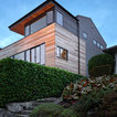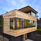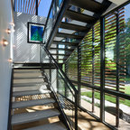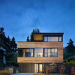 A new Seattle modern house designed by chadbourne + doss architects houses a couple and their 18 bicycles. 3 floors connect indoors and out and provide panoramic views of Lake Washington. The stair uses reclaimed wood and steel. The stair winds around an interior wall of backlit translucent fiberglass.