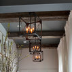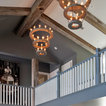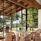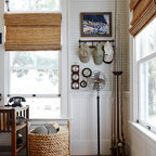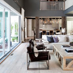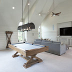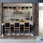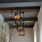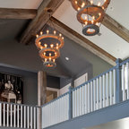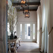 Reclaimed wood beams are used to trim the ceiling as well as vertically to cover support beams in this Delaware beach house.