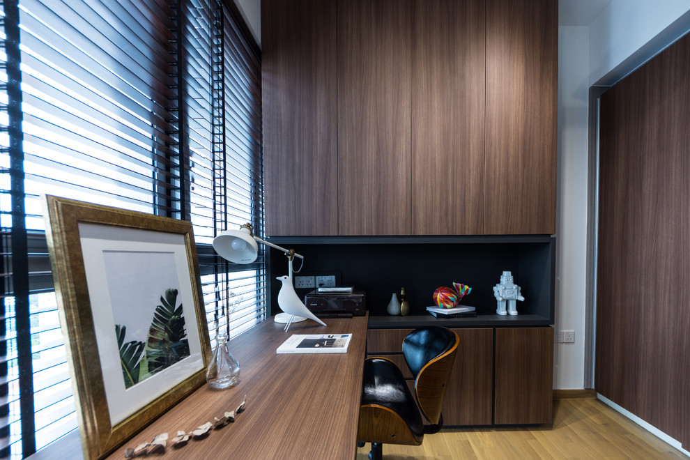 It is the opposite in the study room – dark, strong woodgrain finishes dominate the space. “The room has built-in...