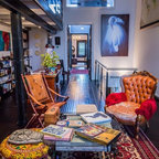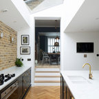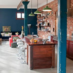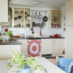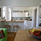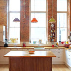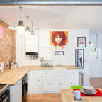Three colourful custom-made colander lights add a splash of colour to this open-plan kitchen in a converted Victorian school house. The kitchen island is custom-made out of a vintage oak chest.