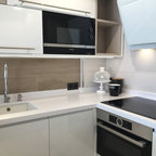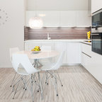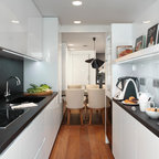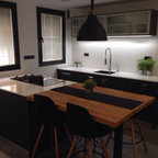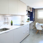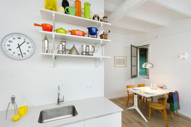 No ha sido tan solo pintura, sino texturas, mobiliario, y el constante movimiento de los que habitan este piso del Eixample barcelonés lo que se ha querido situar sobre un fondo blanco profundo y habitable que se abre hacia los raudales de luz que entran por las ventanas. Un vacío acogedor, funcionalmente resuelto para albergar y dar protagonismo a una pequeña pero interesante colección de piezas de mobiliario, arte y literatura curada por los jóvenes propietarios: Un diseñador industrial y una profesora de idiomas. Lo más valioso que han conseguido entre los dos, no son sin embargo, las reproducciones originales que cuelgan sobre las paredes, ni los clásicos contemporáneos del diseño industrial que salpican la monocromática amplitud del los espacios recién integrados, sino Joaquim, hijo de ambos, que con apenas 4 años ha conseguido colonizar todas las estancias de la casa con un montón de trastos seguramente menos costosos pero mucho más coloridos, resistentes y divertidos.