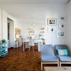 No ha sido tan solo pintura, sino texturas, mobiliario, y el constante movimiento de los que habitan este piso del Eixample barcelonés lo que se ha querido situar sobre un fondo blanco profundo y habitable que se abre hacia los raudales de luz que entran por las ventanas. Un vacío acogedor, funcionalmente resuelto para albergar y dar protagonismo a una pequeña pero interesante colección de piezas de mobiliario, arte y literatura curada por los jóvenes propietarios: Un diseñador industrial y una profesora de idiomas. Lo más valioso que han conseguido entre los dos, no son sin embargo, las reproducciones originales que cuelgan sobre las paredes, ni los clásicos contemporáneos del diseño industrial que salpican la monocromática amplitud del los espacios recién integrados, sino Joaquim, hijo de ambos, que con apenas 4 años ha conseguido colonizar todas las estancias de la casa con un montón de trastos seguramente menos costosos pero mucho más coloridos, resistentes y divertidos.