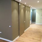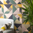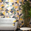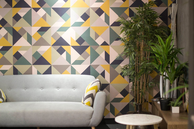 Para dar una vistosa bienvenida decidimos instalar en la pared principal nuestro wallcovering Agustina Cuadrado, en la versión de tonos ocre y oscuros, en un material lavable, con textura ligeramente rugosa, perfecto para espacios contract.