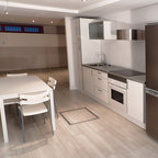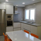 La cocina se amplió anexionando un espacio de servicio, dando lugar a un office para las comidas de diario.El mobiliario se encargó a medida a un carpintero, concediendo gran protagonismo a la isla central y a detalles como colocar luz interior en los cajones y en las vitrinas. El material elegido para los frentes es una melamina gris; los interiores son de nogal. Para la encimera se decantaron por una gran pieza de mármol.Suele cocinar Meritxell, platos sencillos, dice. Solo el fin de semana, cuando disponen de más tiempo, hacen recetas más elaboradas.