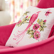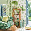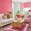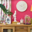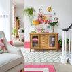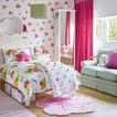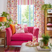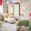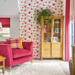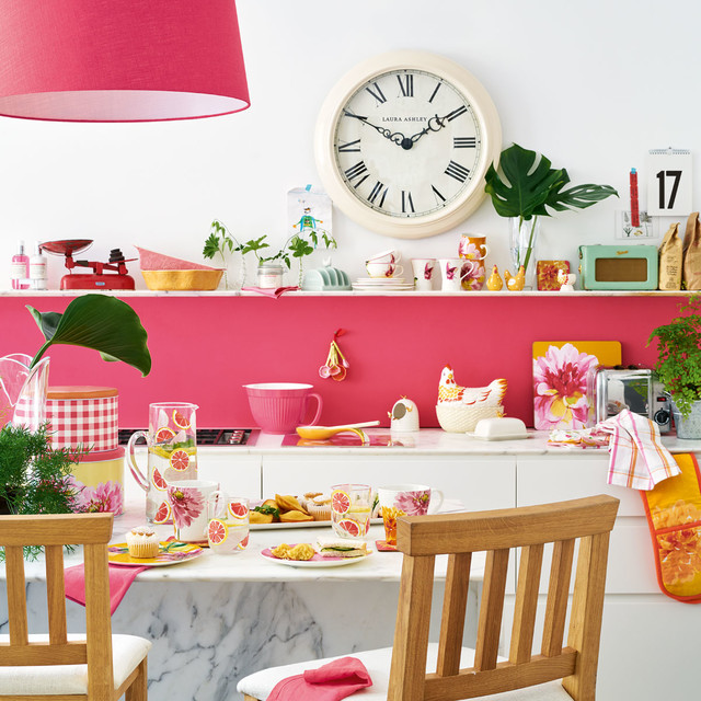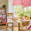 Predomina el color rosa pomelo, tanto en la pared como en los accesorios de menaje. Flores, cítricos, mariposas y pollitos, completan el estampado.
