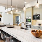 Kitchen in Moline, IL Quad Cities with Fog Gray painted bases and White painted upper cabinetry from Koch Cabinets. Quartz counter surfaces in Hanstone Speechio White.