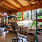 I like that the designer incorporated that roof with this house and made it another level to the house. I also like the nature surrounding the house.
