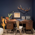 A smooth orange velvet sofa in the living room offers more than a passing nod to the 1970s but the modern shape brings it firmly up to date. 1970s revival is a key trend to look out for as you tour the house; ‘velvet sofas’, ‘brass’ and ‘houseplants’ were search terms that spiked in popularity on Houzz in 2017, and all have their roots in this bold decade.Wall paint, Cobalt Night, Dulux. Ultimate two gang socket, in gloss black, Schneider Electric.