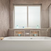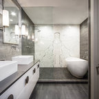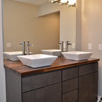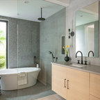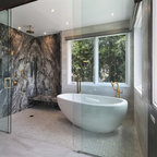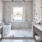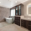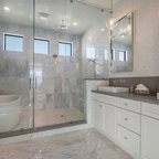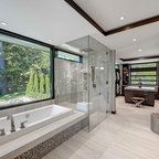 The new design provides a larger shower, free-standing tub, increased storage, a window for the water-closet and a large combined walk-in closet. This contemporary spa-bath offers a dedicated space for each spouse and tremendous storage.