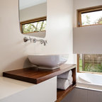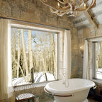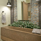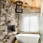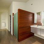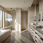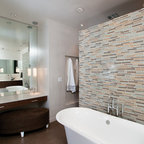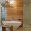 Master bath with a free standing tub, wall mounted faucet and controls. Cedar planked wall divider with glass doors each side to access the shower and toilet room