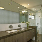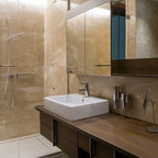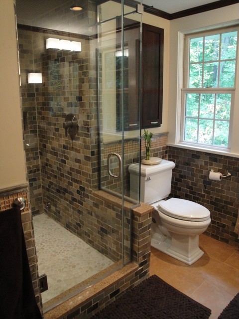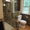 Updated master bathroom with earth tones and open feel.