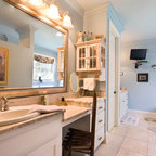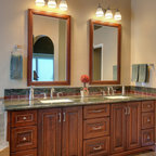 We utilized a Moroccan inspired mirror to accentuate and play with the unusual slanted roof line. By adding clean lines and ample drawers for storage, we were able to transform this outdated bathroom into a true modern master retreat.