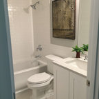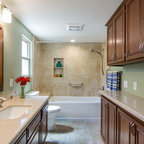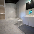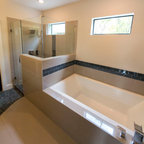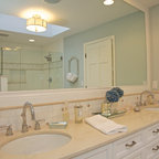 We utilized a Moroccan inspired mirror to accentuate and play with the unusual slanted roof line. By adding clean lines and ample drawers for storage, we were able to transform this outdated bathroom into a true modern master retreat.
