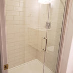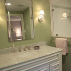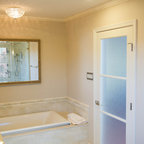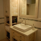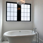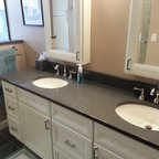 We utilized a Moroccan inspired mirror to accentuate and play with the unusual slanted roof line. By adding clean lines and ample drawers for storage, we were able to transform this outdated bathroom into a true modern master retreat.