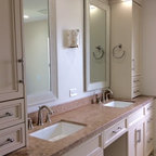 We utilized a Moroccan inspired mirror to accentuate and play with the unusual slanted roof line. By adding clean lines and ample drawers for storage, we were able to transform this outdated bathroom into a true modern master retreat.