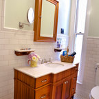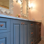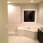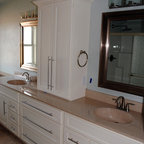 We utilized a Moroccan inspired mirror to accentuate and play with the unusual slanted roof line. By adding clean lines and ample drawers for storage, we were able to transform this outdated bathroom into a true modern master retreat.