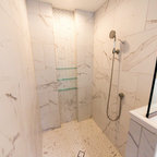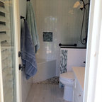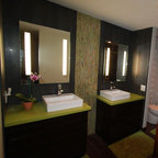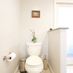 Note the window treatment that are very minimalistic and also that cover starting from the bottom, so we could obtain privacy without having to totally obscure the view. Closing from the bottom also might mean they'd be easier to close; not sure about this.