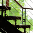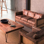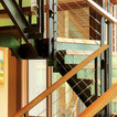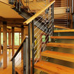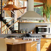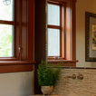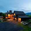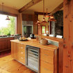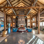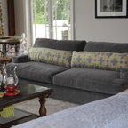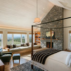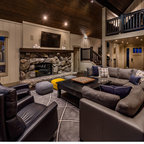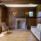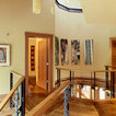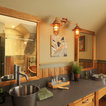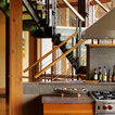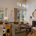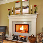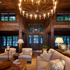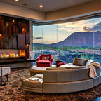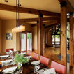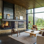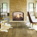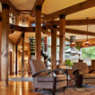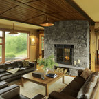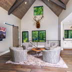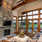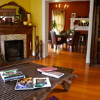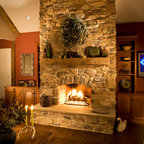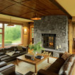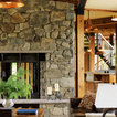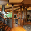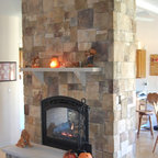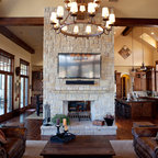 Living room looking towards kitchen with dining room on other side of double sided fireplace.