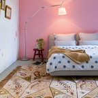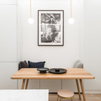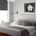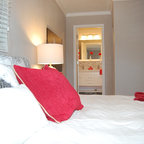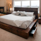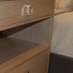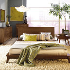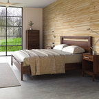 The design of the Contour bed is quite remarkable: a beautiful bed has been fashioned around several basic design elements that we hear customers request over and over again: first, every sharp corner has been replaced with space efficient and visually appealing contours from which the bed takes its name. Second, so that there will be no more toe-stubbing, and to stay in keeping with the contour motif from the headboard and mattress base, the bed legs have been recessed deep inside the frame as solid contoured wood beams following the shape of basic bed legs downward but have been unified horizontally. Thirdly, the mattress sets inside the bed base 4" so that it's still easy to change the sheets while visually the mattress will not block the beautiful solid wood beveled headboard. And lastly, this bed truly is current in its design proportions: it is neither too low to the floor like too many modern styled beds nor is it too high like the very traditional style beds. Visit us in San Francisco to see this bed yourself or order online. We ship to most areas across the continental U. S. A.