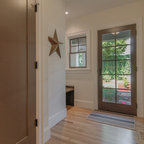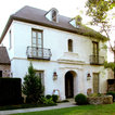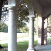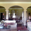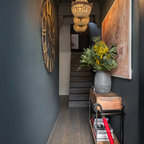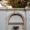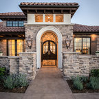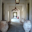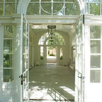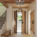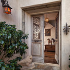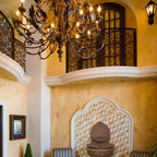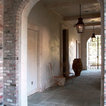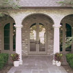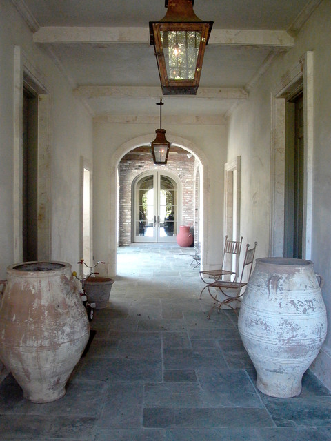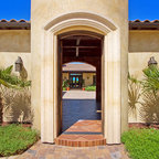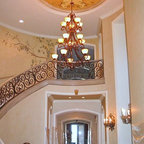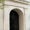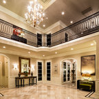 This is another view of the interior of the elegant old world style Entry Hallway. Featured are four Macedonia Limestone custom Cased openings, a Macedonia Limestone Arched Cased Opening, Macedonia Limestone wrapped Beams at the ceiling with custom designed Crown Molding, and Macedonia Limestone Baseboard Molding. Photography by Darvis.