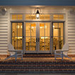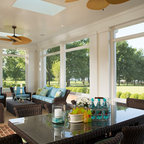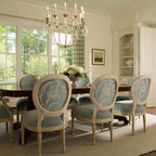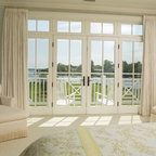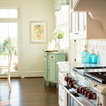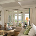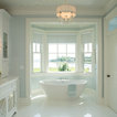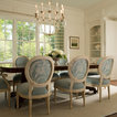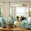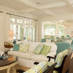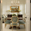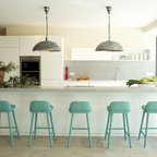 Normally, I don't love all white--a lot of white, but not all white. Here, though, it's really warmed up with the light and the blue-green chairs.