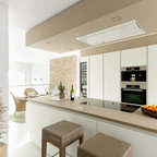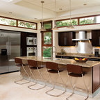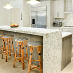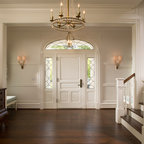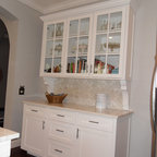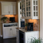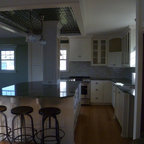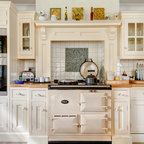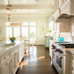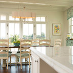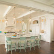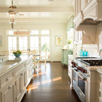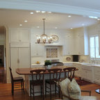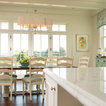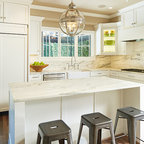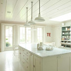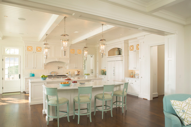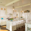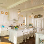 Traditional white kitchen with pendant lights and double islands