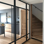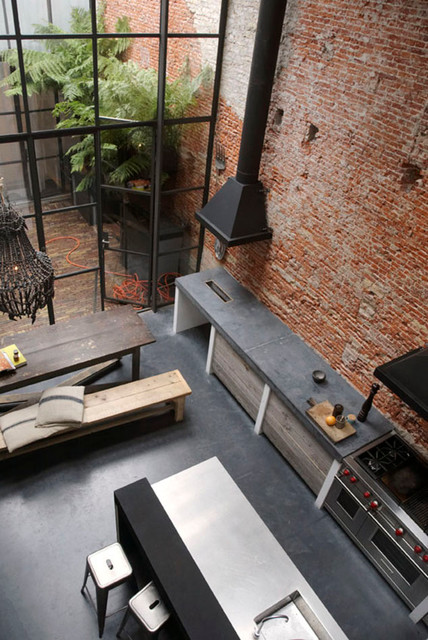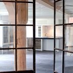 Exposed brick work, reclaimed wood, metal framed doors and double height.