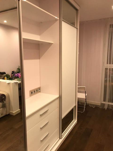 Материал исполнения: мебельная плита EGGER, цвет Белый альпийский; профиль S1200 Серебро; наполнение двери: зеркало серебро, стекло Matelac 9003
