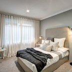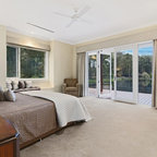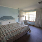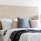 Timber wall paneling is used as a backdrop to the bed. An ensuite door is concealed within the paneling and when closed disappears.