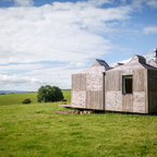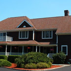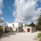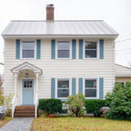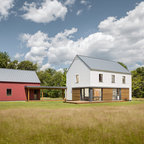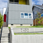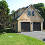 front elevation -simple and clean. reduce height by carrying carport roof line on building with different materials - natural finish below and paint above