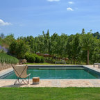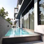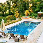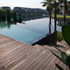 Höherer Pool dunkel mit Überlauf und Holzterasse