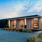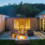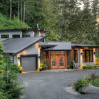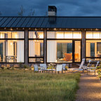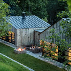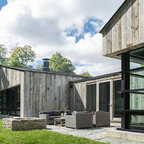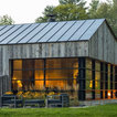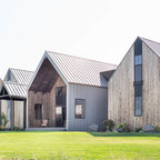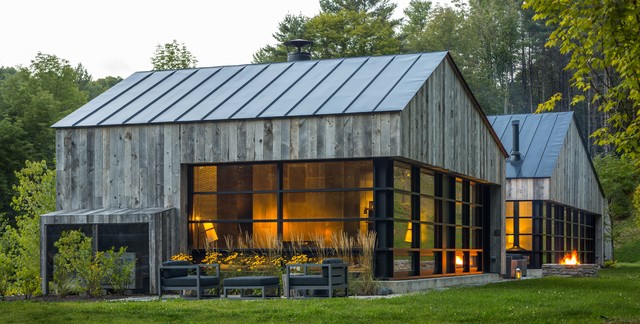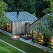 Black metal roof, black windows, grey washed barn wood and add in light stone