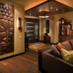 “The floating bamboo ceiling references the vertical reed-like wallpaper behind the LED candles in the niches of the chiseled stone.”