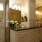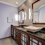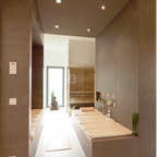 My dream restroom design. I love the earth tones and lighting accenting bath ledge